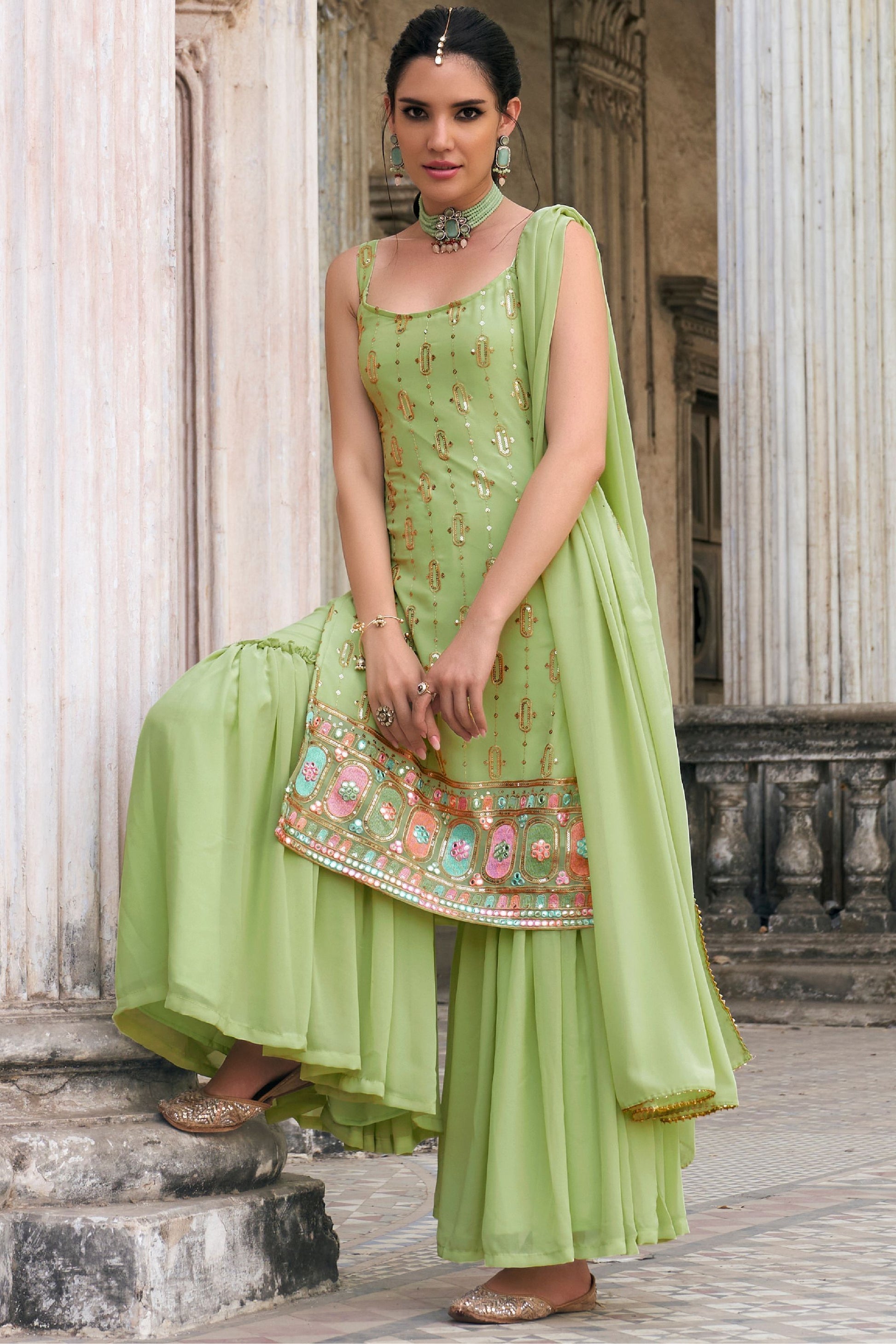 Green Georgette Sharara Suits - Thread & Sequence Embroidery Work