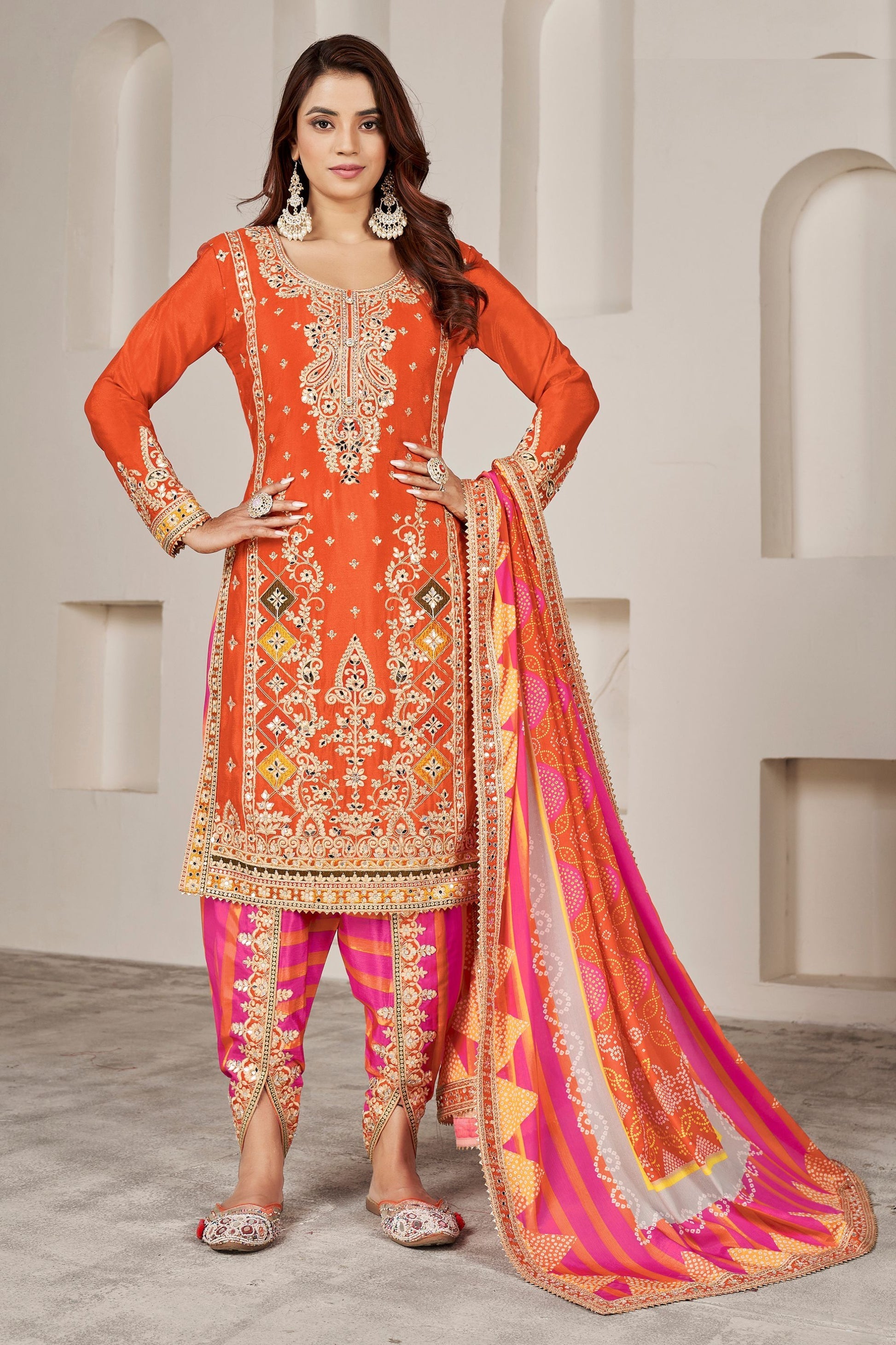 Experience luxury and elegance with our Orange Chinon Silk Salwar suit. Designed with intricate Sequence Embroidery, Dori Work, Print Work, and Mirror Work, this suit is perfect for any special occasion. Made from high-quality silk, it offers a comfortable and stylish fit. Elevate your style with this stunning piece.
