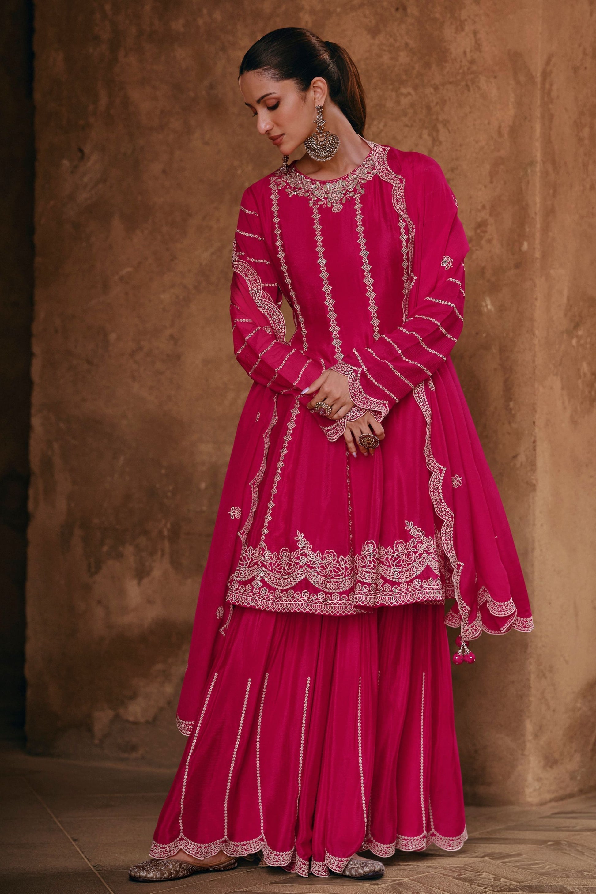 Pink Chinon Silk Sharara Suit - Embroidery Work