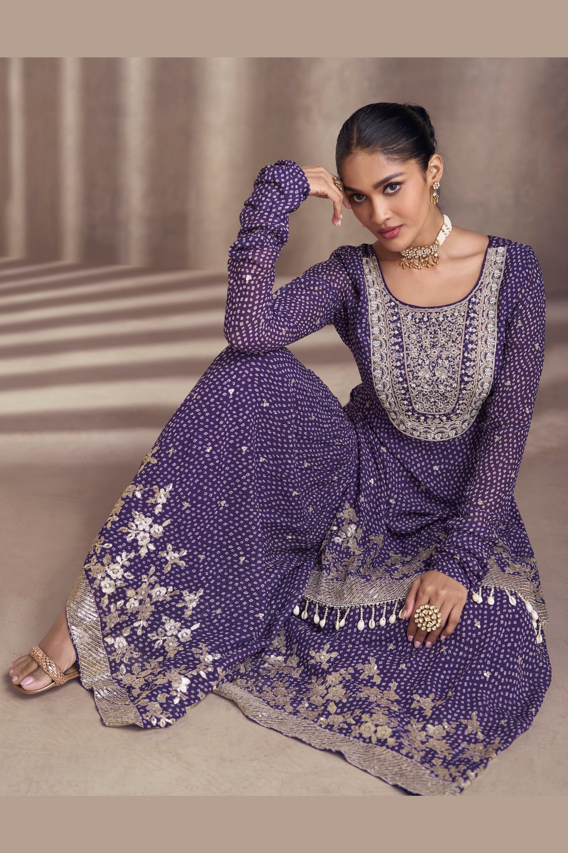Purple Chinon Silk Sharara Suit - Embroidery Work